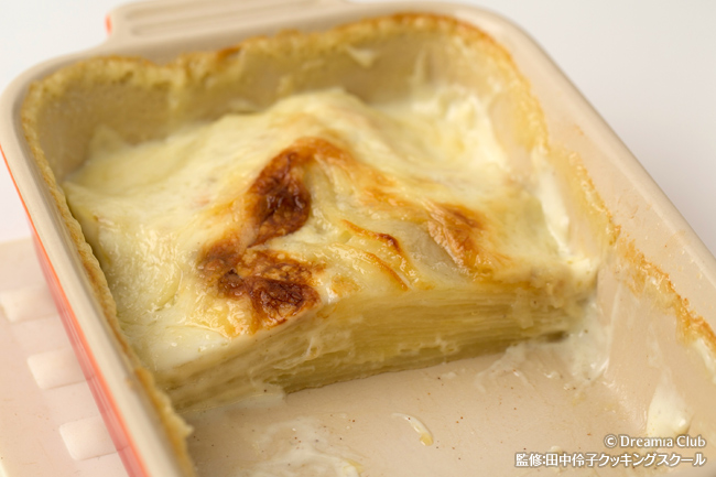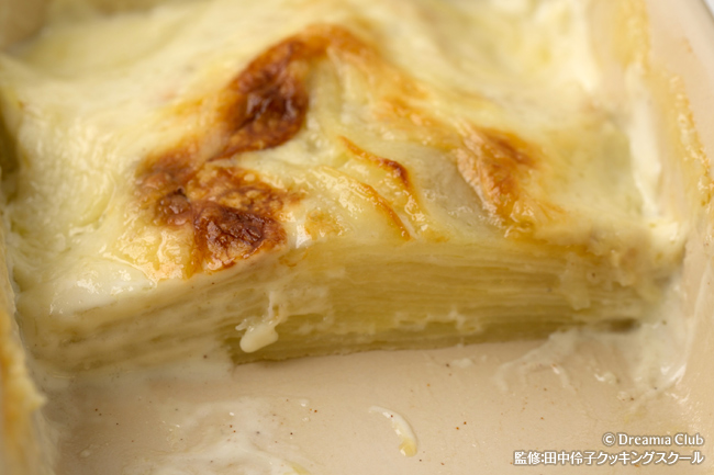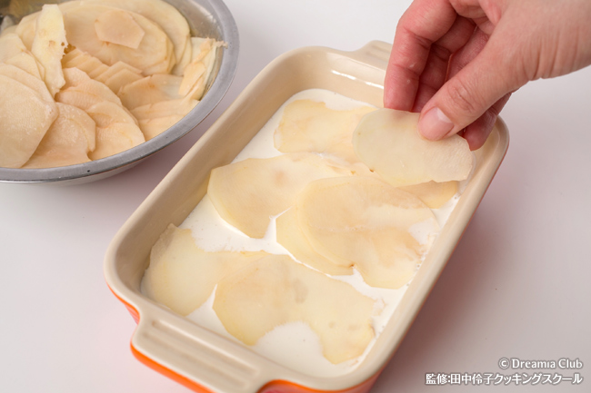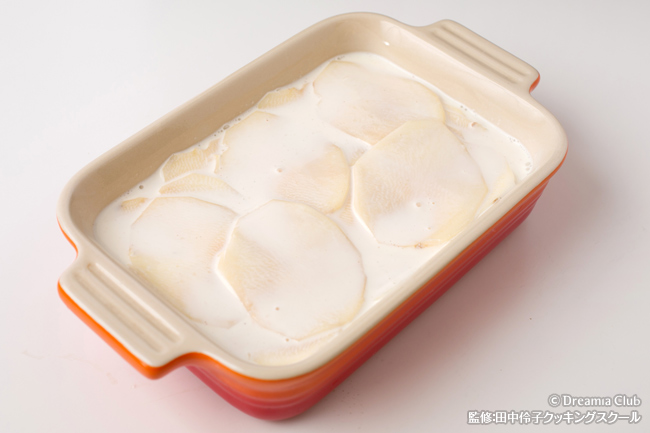 じゃがいもの持つでんぷんでクリームを固めるので、じゃがいもを切った後は水にさらさないでください。