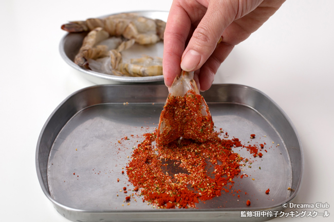 - 海老は背開きにして背ワタを取り、塩、胡椒しておく。