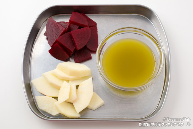 - 一口大に切ったりんごとビーツを合わせて、ビネグレットソースで和える。