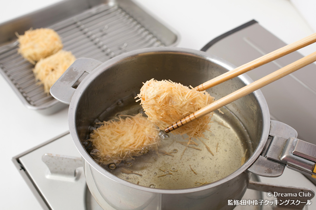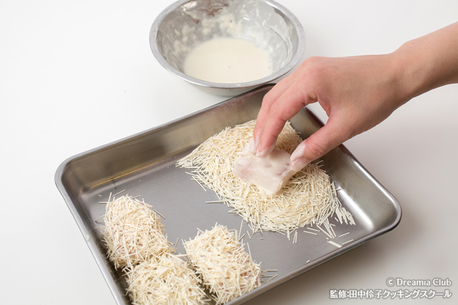 - 1の魚に衣を付けて、そうめんをまぶす。揚げ油を中温(170~180℃)に熱して、きつね色になるまで揚げる。