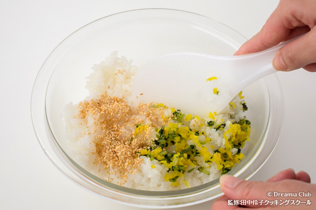 - 漬物(たくあん、みずななど、合わせて30g)をみじん切りにし、白ゴマとともに酢飯に混ぜ込む。