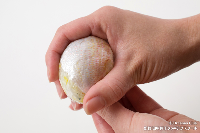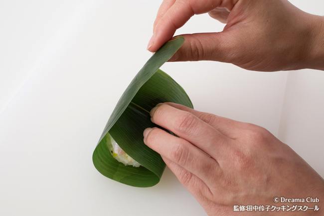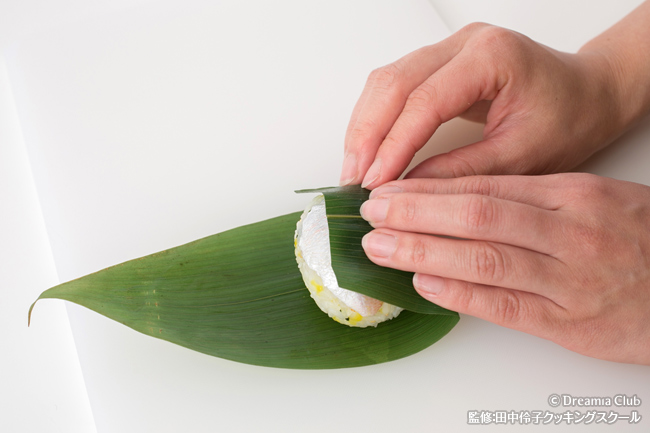 - ラップに具をのせ、酢飯を置いて俵型に握り、笹の葉で包む。