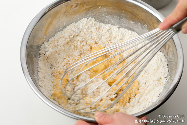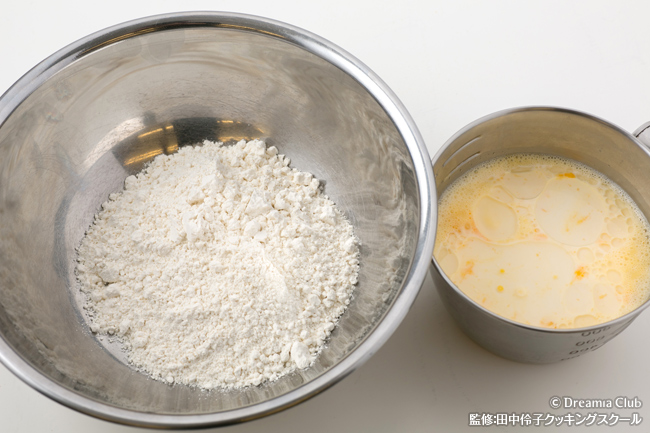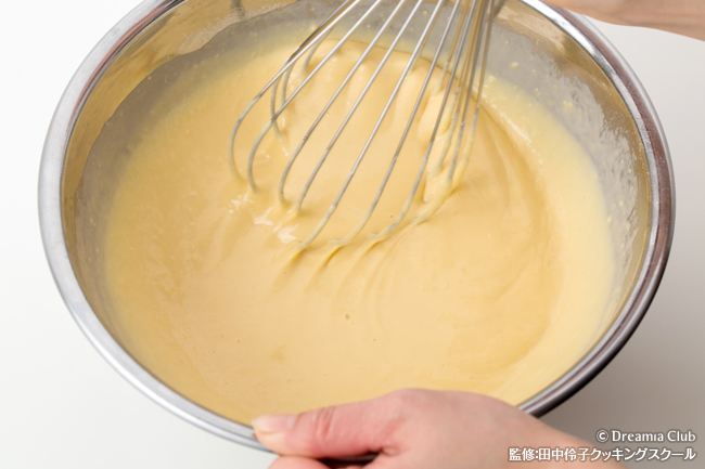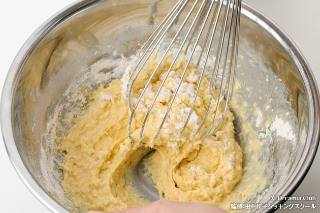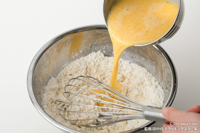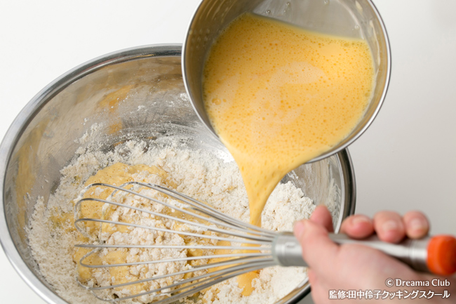- 牛乳、卵、オイルを混ぜ、2に少しずつ加えてよく混ぜる。型に7分目まで入れる。