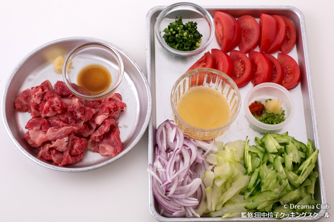 - 牛肉をナンプラーとにんにくで下味をつけ、テフロン鍋で強火で軽く焼き、一口大に切る。