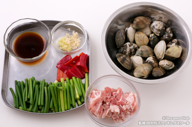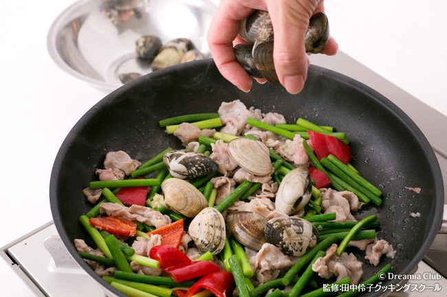 - 2にあさりを加えて炒める。