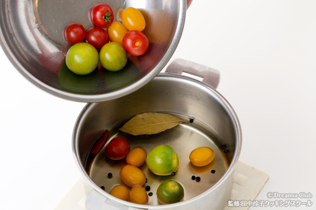 - プチトマトを2に漬ける。(1時間以上から3~4日まで美味しいです。)
