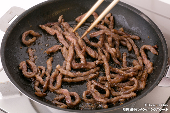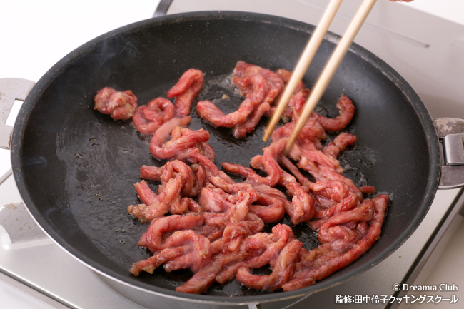 - 牛肉はAで下味をつけて、フライパンでサッと焼いておく。
