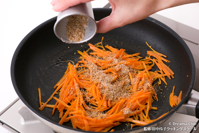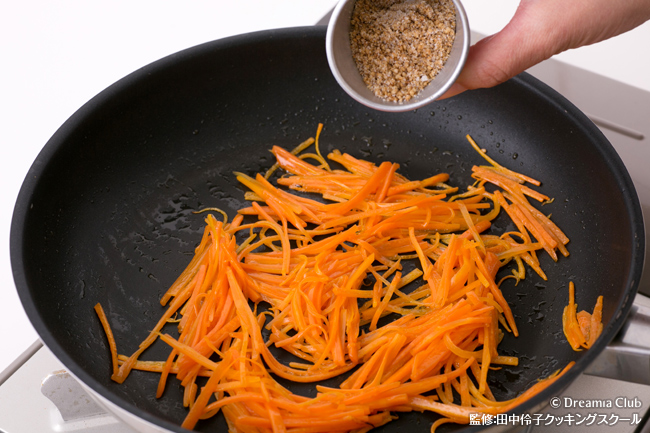 - 人参は千切りして、少量の油(分量外)で炒め、Cで和える。