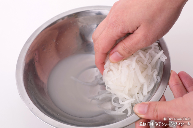 - 大根は千切りにして、塩小さじ1/3(分量外)で塩もみして洗い、水気をよく絞ってDで和える。