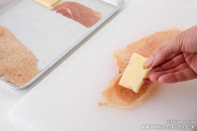 - 薄切りした鶏肉の間に生ハム、チーズを挟んで、衣をつける。