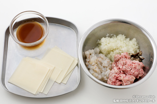 - 海老、水で戻した干し椎茸、玉葱、生姜をみじん切りにし、豚挽肉、Aの調味料を合わせてよく練り、12等分する。