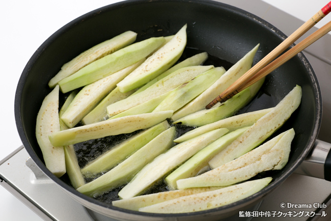 なすはトロトロになるまで揚げ焼きしてください。多めの油で焼く際に一旦油を吸いますが、火が通ってきたら油が出ます。