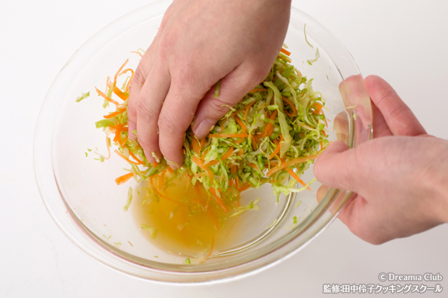 千切りした野菜は、塩もみして予め余分な水分を取ることが大事です。