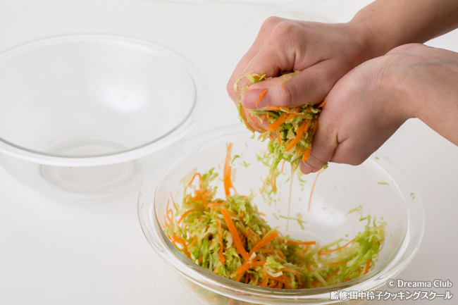 - キャベツと人参に、塩小さじ1(分量外)を揉み込んで10分ほどおき、よく絞る。