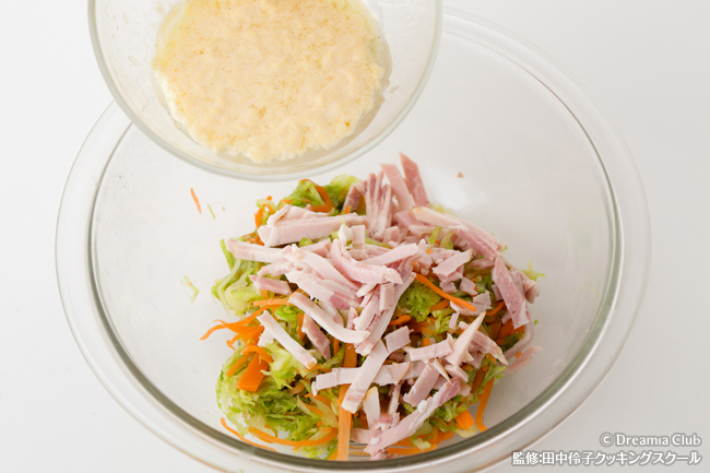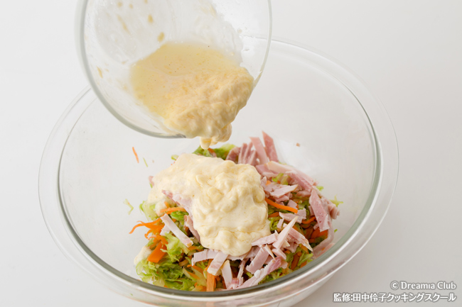 - ドレッシングの材料をよく混ぜて、2とハムと和え、パセリのみじん切りをふる。