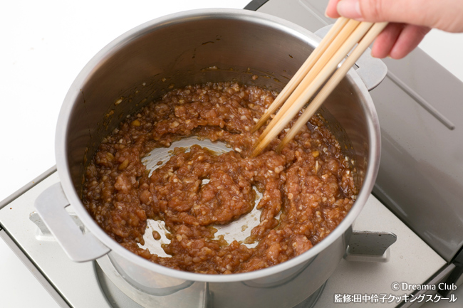 - 鍋に挽肉と調味料の全てを入れ、お箸を4本持って混ぜてばらしてから火に掛ける。