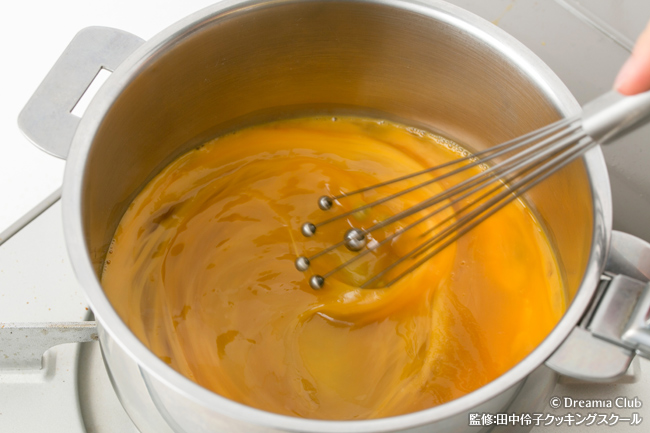 - 卵に調味料を全て加えてよく混ぜ、フライパンで炒り煮する。