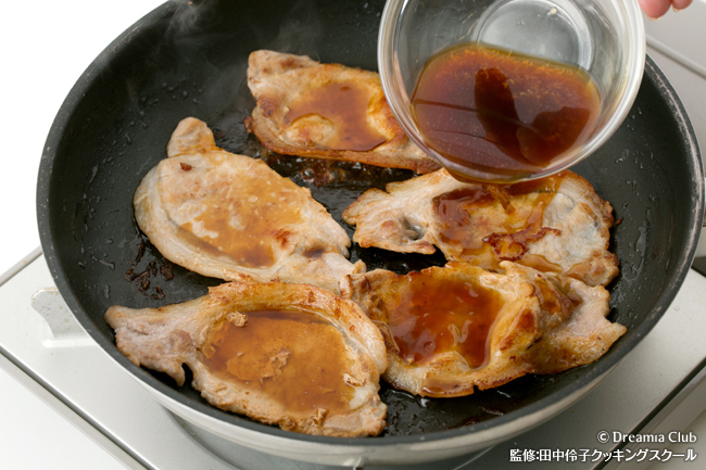 豚肉を漬け地に漬けて焼く方法もありますが、漬けないでカリッと焼き、絡める方法です。