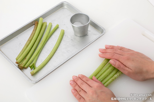 - ふきは適宜切り、まな板にのせて塩をたっぷりまぶして両手で転がす(板ずり)。