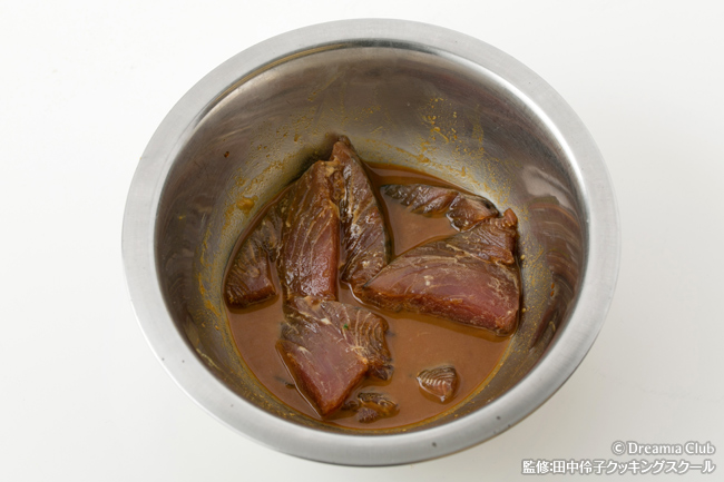 - かつおは8mmほどの薄切りに切り、練がらしと醤油を混ぜて10分ほど漬ける。