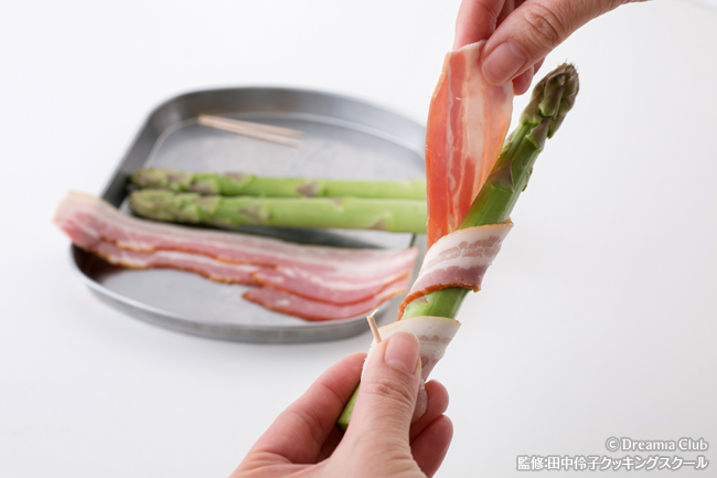 - アスパラガスにベーコンをくるくると巻く。