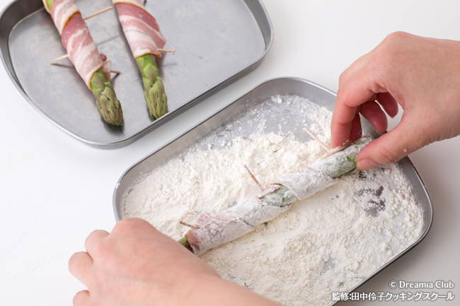 - ベーコンが外れないように、小麦粉、卵、パン粉と衣をつける。