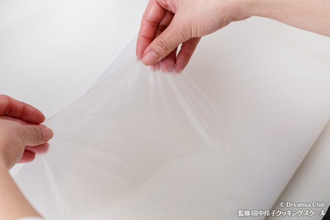 - ライスペーパーは水にサッとつけて、まな板に置く。