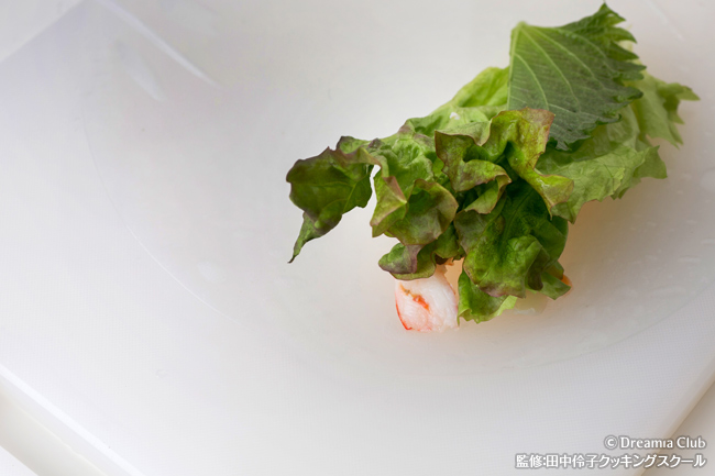 ライスペーパーで具材を巻く時は、海老、ニラ、サニーレタスの順にのせて、外側に見えるようにするとときれいに仕上がります。