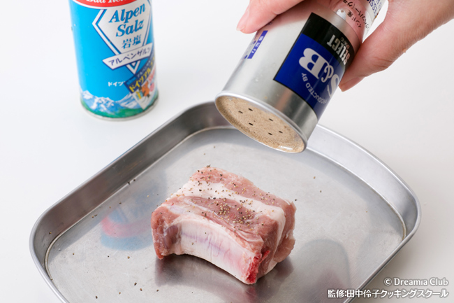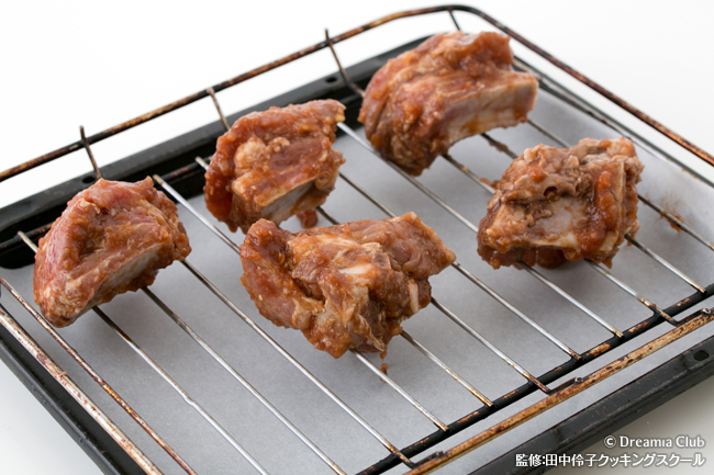 - スペアリブに塩、胡椒をして、ソースに半日漬け込む。