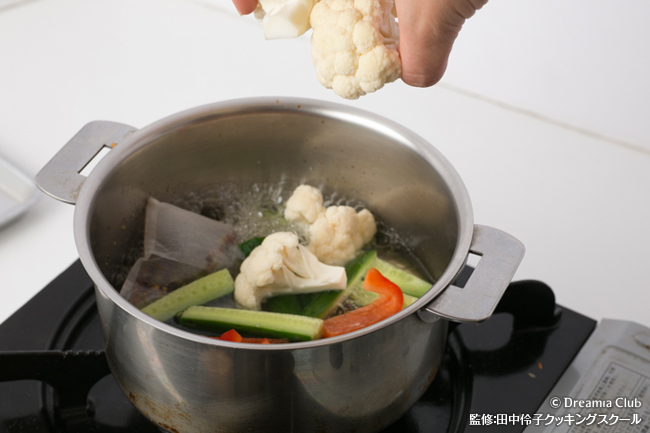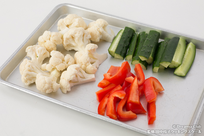 - カリフラワーは小房に分け、きゅうり・赤パプリカは5cmの短冊に切る。