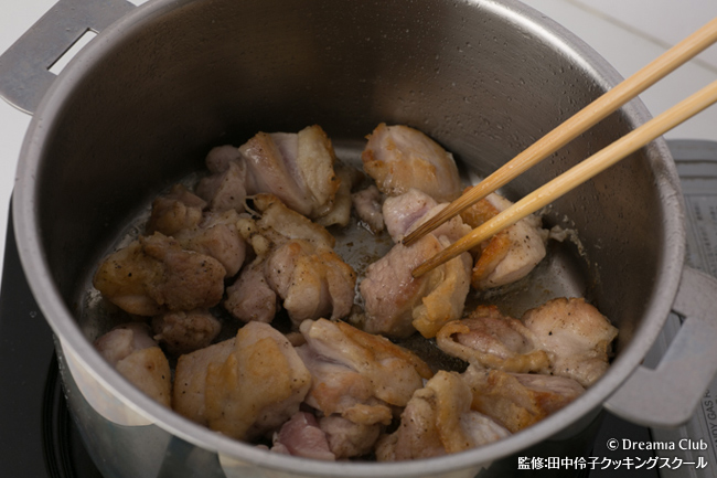 - 鶏肉は塩・胡椒・小麦粉をまぶして、鍋に油を熱して強火で焼き色をつけ、取り出す。