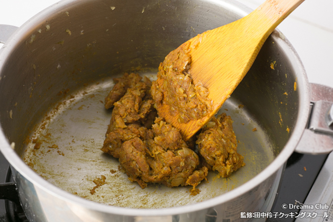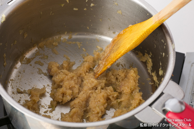 - 玉葱、にんにく・生姜のみじん切りを入れ、中火で飴色になるまで炒める。