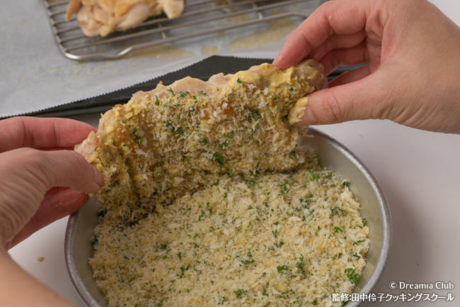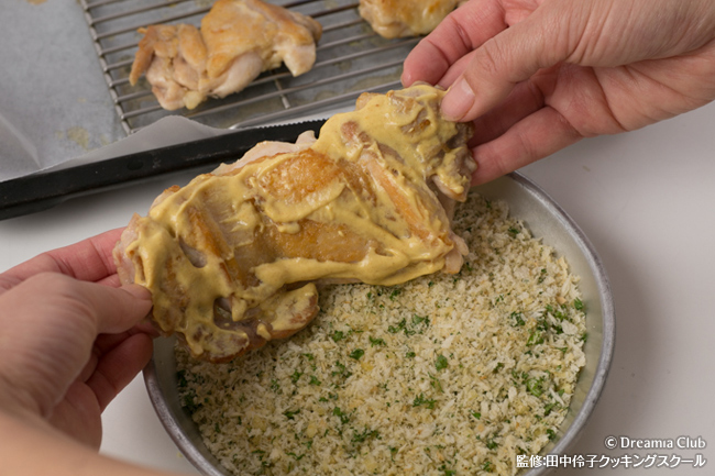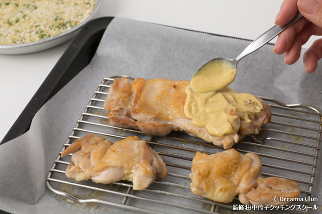 - 鶏肉を取り出して皮にマスタードを塗る。