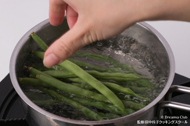 いんげんは茹でた後、水に取らずに陸上げ(※)したほうが水分が切れて仕上がりが水っぽくなりません。陸上げの場合は余熱が少し入るので少し固めの茹で加減で引き上げます。