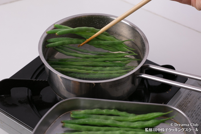 - いんげんを塩湯で1分茹でて陸上げする。