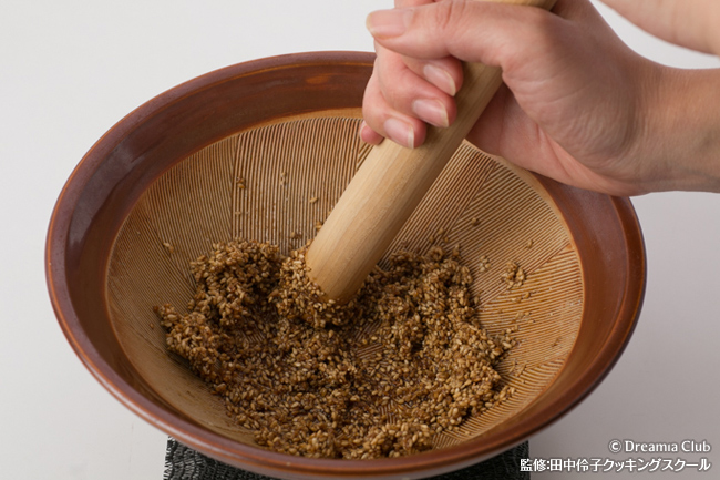 - 白ゴマを炒ってすり鉢で摺り、砂糖・醤油を加えてなめらかになるまで摺る。