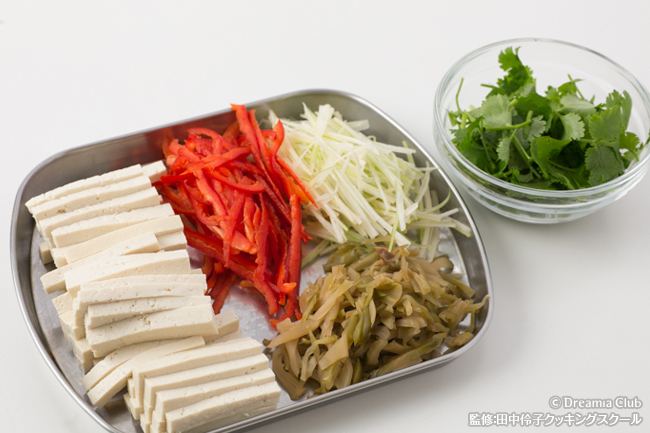 - 豆腐を布巾に包み、重石をして1cmの厚さになるまで押して千切りにする。
