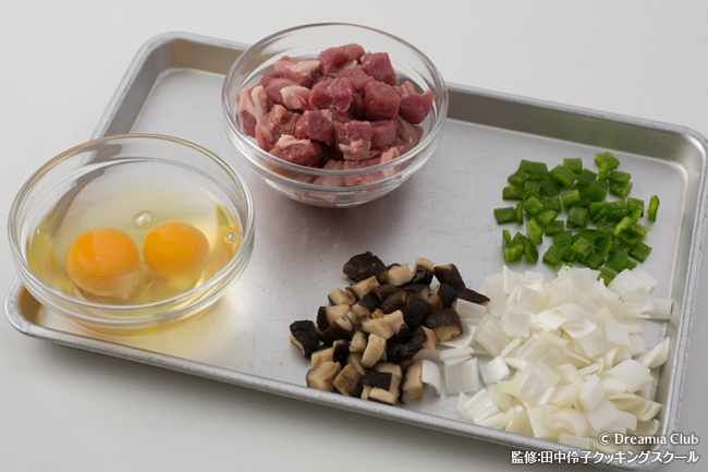 - 豚肉・水で戻した干し椎茸・長葱を1cm角に切る。