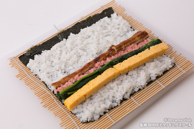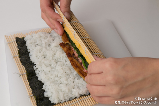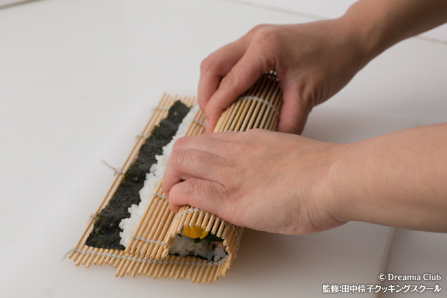 - 海苔を巻きすにのせ、手前2cm、向こう4cmを残して酢飯を広げ、中央に具をのせて、中指で具を押さえて向こうの酢飯まで重ねて巻き、形を整える。