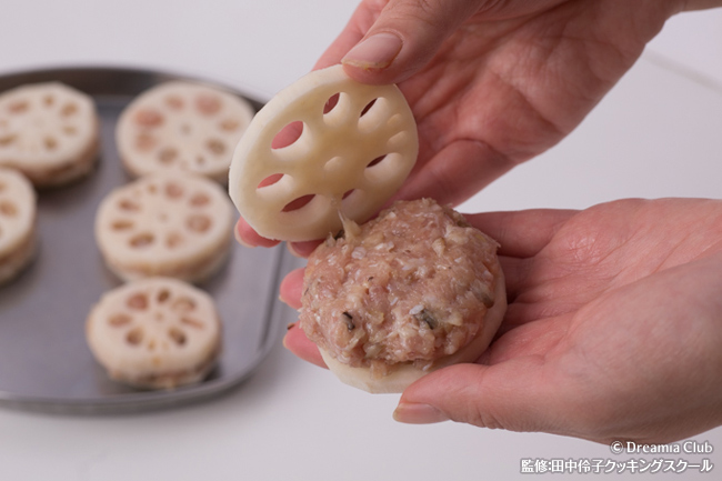 - れんこんの水気をふき取り片栗粉をふって2をサンドする。