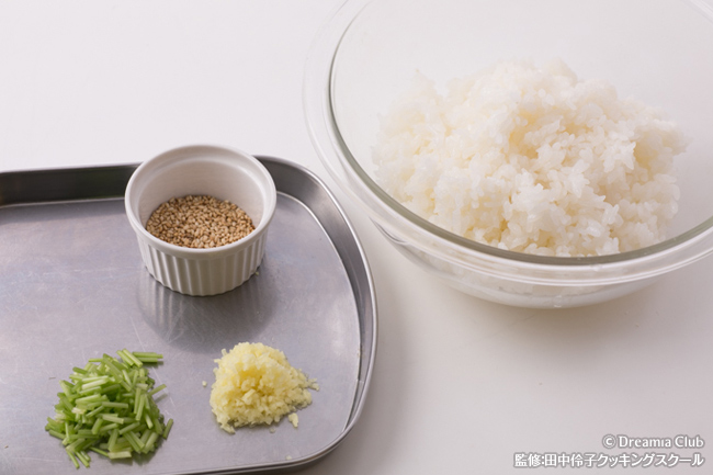 - 三つ葉・生姜をみじん切りにして、炒りゴマと共に1に混ぜて、8等分に丸める。