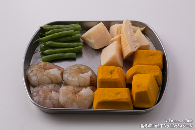 - だし汁にAで味をつけ、海老を入れ、たけのこ・かぼちゃを加え、海老は火通ったらいったん取り出し殻をむき、かぼちゃに火が通るまで煮る。