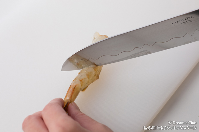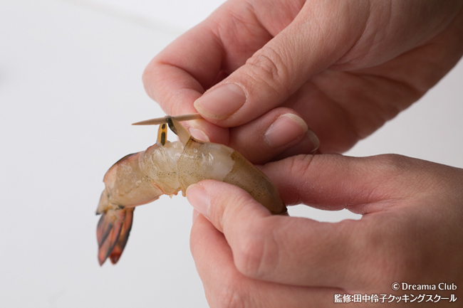 海老は尾のとがった部分に水分が入っている場合があるのではねないようにつぶして抜いておいてください。