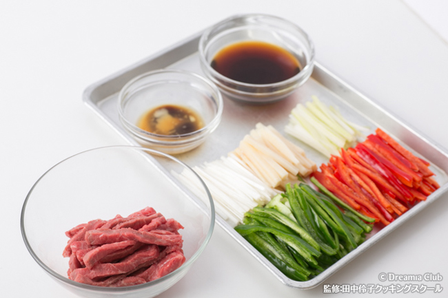 - 牛肉は5cm長さの千切りにしてAで下味をつけ、炒めておく。