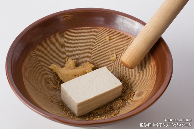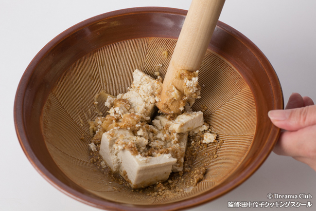 - すり鉢でゴマを摺り、豆腐を加えて滑らかになったら他の調味料も加えて具を加える。