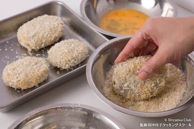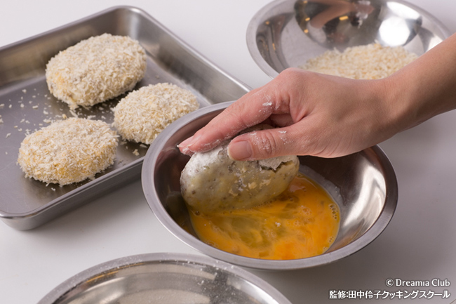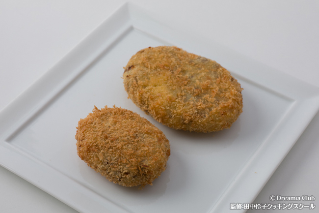 - 1と2を混ぜて、塩・胡椒で味をつけて4等分にして小判型に成形し、パン粉づけし、170℃で3分揚げる。