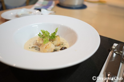 「メインディッシュは帆立です。ヘーゼルナッツのソースは簡単なのに良い組み合わせになったなと思います。ちょびっとお醤油も入ります。秋らしくマッシュルームも使っていきますね。」