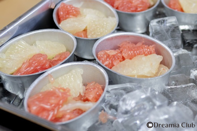 先生のお教室では、レッスンがスムーズに進むよう、材料なども先に切って仕込まれており、デザートのグレープフルーツも、鮮やかに生徒さんの前に登場です。
