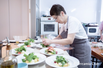 先生のお教室はコース形式。まずはサラダを盛り付けて、1皿ずつ生徒さんにサーブしていきます。