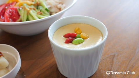 「今日の茶碗蒸しは枝豆とトウモロコシにしています。これからの時期にぴったりだなと思って。栄養的にも、枝豆は夏バテ予防にもなりますし、トウモロコシは水分代謝をよくするので湿気の多い時期に良いんです。」